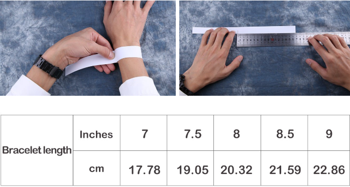 Step 2: Add one inch, or 2.5 centimeters, onto this measurement to get the final length of your bracelets. (Please be noted that a bracelet is perfectly sized when you measure your wrist tightly and add 2 or 3cm. If you are between sizes, ask yourself how you like to wear your bracelet. If you wear it tightly choose the smaller size and if you like to wear it loosely take the next size up.)
